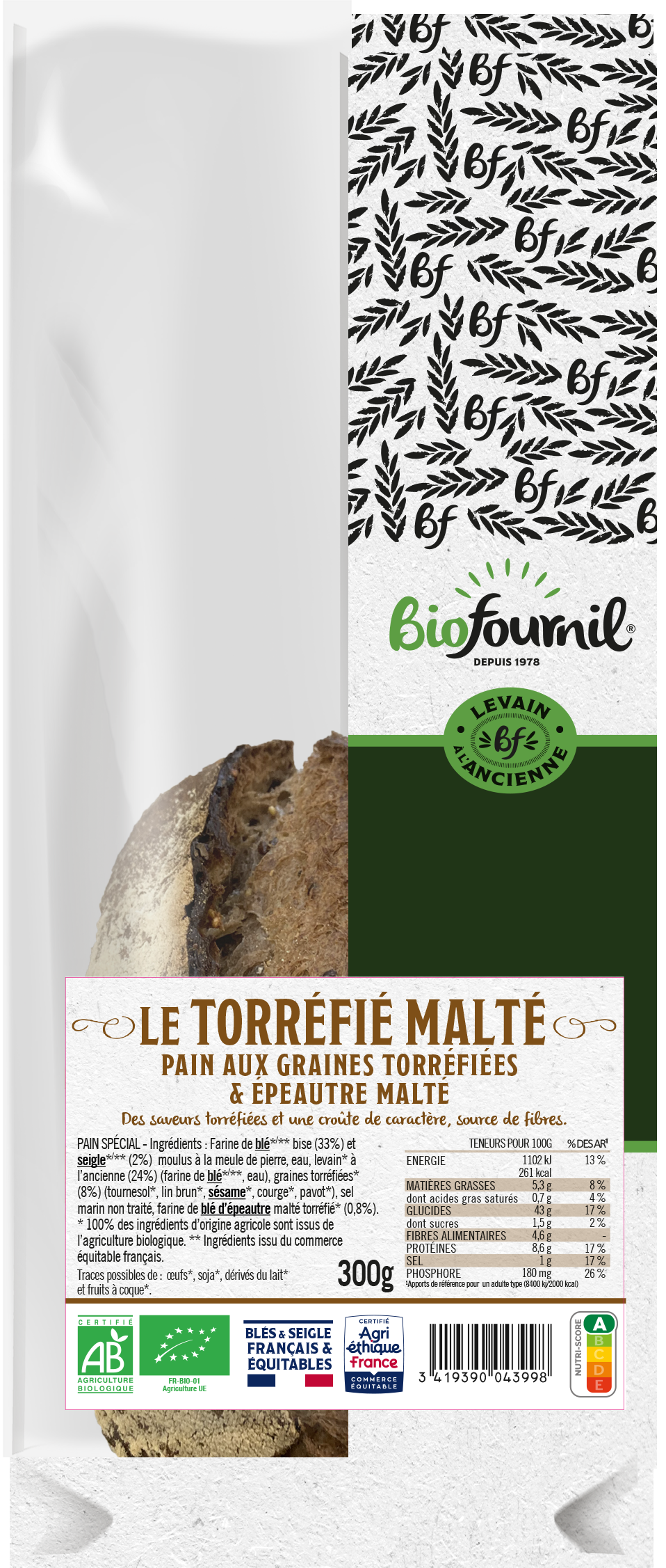 Doté d’un nutriscore A, le pain torréfié malté ne manque pas de vertus nutritionnelles. Il est riche en fibres (6,1g pour 100g), également source de phosphore et de magnésium. Labellisée « Agri Éthique France », la farine à la base de la fabrication est issue de champs de blés cultivés dans l’ouest de la France. La Minoterie Suire, partenaire 100% bio et historique de BIOFOURNIL, est située à seulement 30 km du fournil implanté au Puiset-Doré (village du Maine et Loire). BIOFOURNIL travaille depuis plusieurs années sur la base d’un engagement pluri-annuel avec son minotier et les agriculteurs et garantit une juste rémunération du prix du blé et des farines.