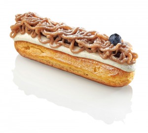 Eclair à la vanille bourbon de Madagascar surmonté de délicieuse crème de marron parsemé de craquants cassis.