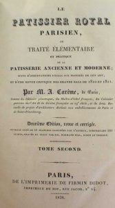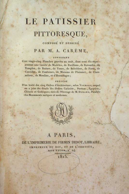C’est entre 1813 et 1815 qu’il écrit ses livres sur la pâtisserie. Il rédige grâce à ses études sur l’architecture « le Pâtissier Pittoresque » en 1815. C’est une grande révolution et même très audacieux. Ce livre est destiné principalement aux pâtissiers. Très novatrice, l’idée de faire paraître des planches représentatives des pièces sera reprise par ses successeurs : Jules Gouffé, Garlin Garlin, Victor Morin…
