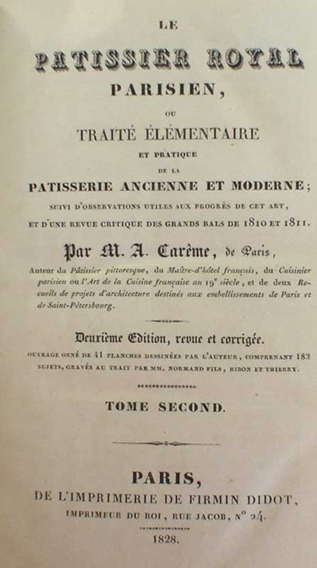 Dans « le Pâtissier Royal Parisien », édité également en 1815, on retrouve de la pâtisserie ancienne et moderne et toutes sortes de présentations sur socle. Comme nous l’avons vu, il nous donne aussi des recettes salées comme la Chartreuse de Bécasse aux Truffes, les Tourtes de Ris de Veau Champignons et Artichauts. Il nous donne aussi son fameux « Gâteau de Plomb », tant prôné par Pierre Lacam, qui en fait une éloge dithyrambique dans son « Mémorial de Pâtisserie ». Il parle aussi des écrits d’antan et fait quelques critiques sur les ouvrages écrit jusque-là.