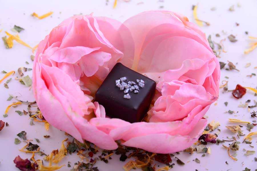 MV – En général, un chocolat est associé à un, voir deux parfums. Les Fragrandises combinent jusqu’à quatre arômes différents. La recherche des équilibres a été très difficile à trouver. Nous n’étions pas habitués à manier les huiles essentielles. Une goutte suffit à faire basculer la recette. C’est extrêmement sensible. Il nous a fallu de nombreuses séances de dégustation et un échange constant avec Madeleine et Sophie pour arriver à une solution satisfaisante pour la créatrice, le nez et le chocolatier.