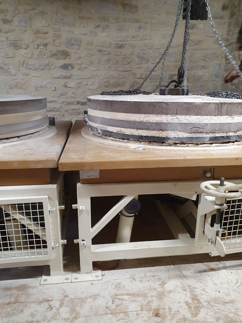 Le BIO ne peut pas, aujourd’hui, fournir la totalité des artisans boulangers en farines de qualité, nous le savons tous ; en revanche, la totalité des artisans boulangers mesurent, dans cette période sanitaire tumultueuse, combien il est important de maîtriser ce qui nourrit l’homme, des céréales jusqu’au produit fini qu’est le pain. Le moulin de Colagne écrase actuellement 80 % de sa production en BIO, seigle, petit épeautre, blés anciens, exclusivement sur meule de pierre de silex. Le choix du meunier de conserver et entretenir ses meules de pierre contribue en grande partie au succès et à la réputation du moulin de Colagne. Une meule de pierre, qui ne tourne qu’à 100 tours/minute, fait que la production de farine ne dépasse pas 170 à 180 kg à l’heure. Ici, on privilégie la qualité sur la quantité.