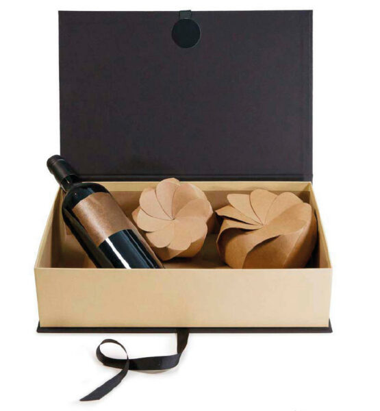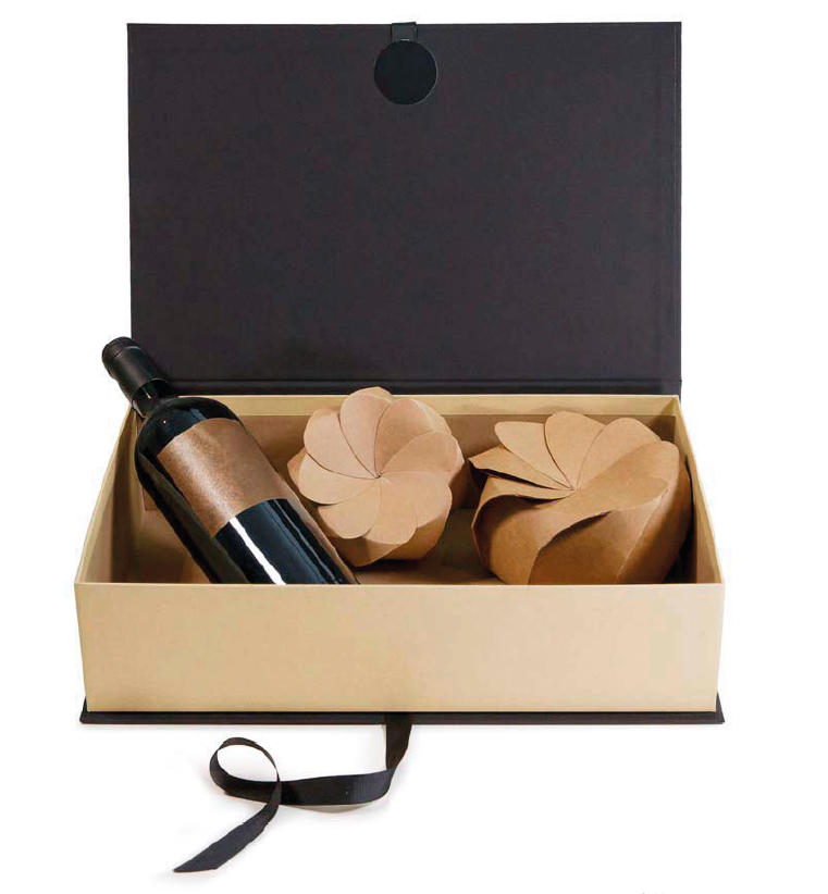 à emporter, il sera également idéal utilisé comme coffret cadeau, avec son couvercle attenant qui se ferme avec un élégant ruban noir satiné. Malgré son design sophistiqué, Allure demeure pratique : livré à plat, il se monte facilement et rapidement grâce à des bandes adhésives. Pour s’adapter à tous les usages, il existe aussi avec un couvercle séparé.