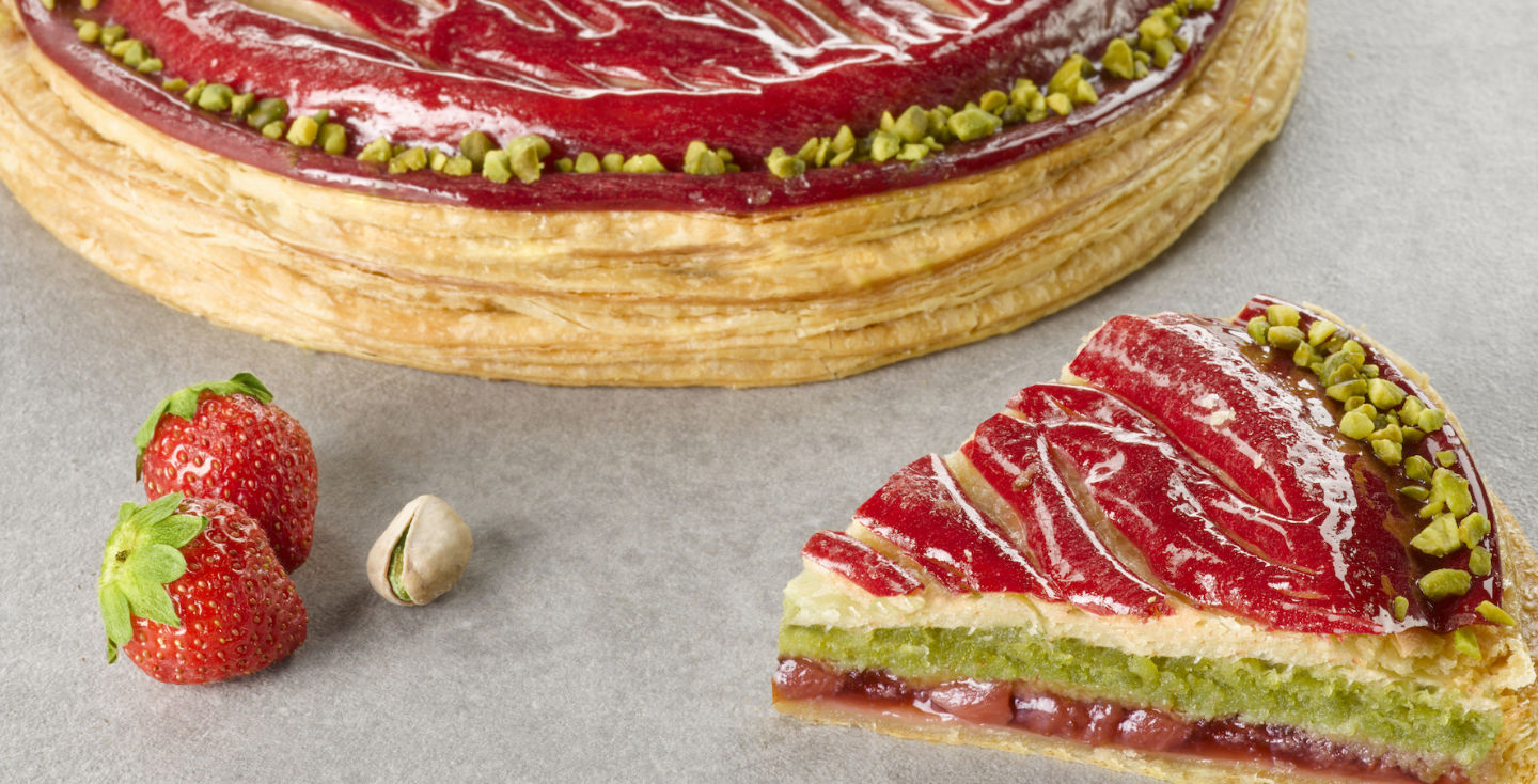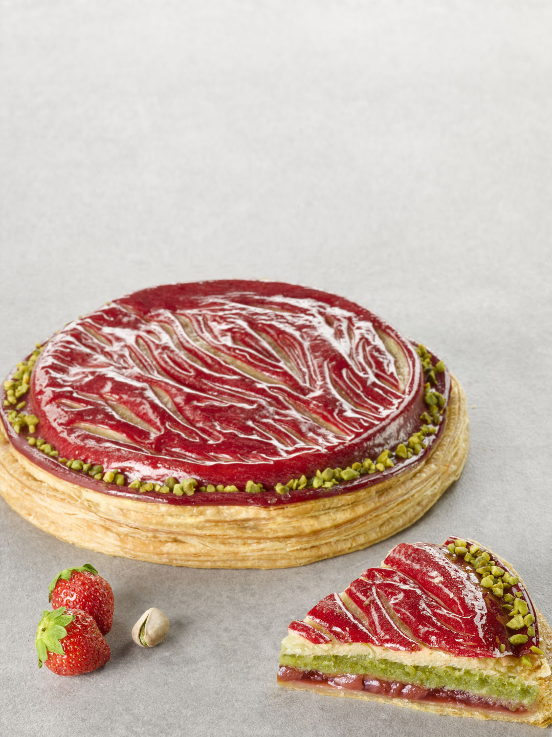 - Sur le fourrage fraise, dresser en spirale la frangipane pistache.