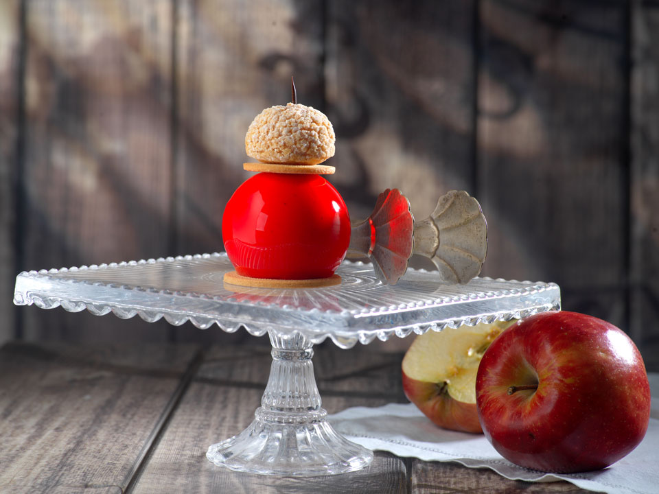 Son croustillant caramel fleur de sel, son fourrage pomme caramel, sa mousse vanille garnissant le chou recouvert d’un glaçage miroir et son décor Brin Noir Dobla® composent un fruit défendu dans lequel il fait bon croquer…