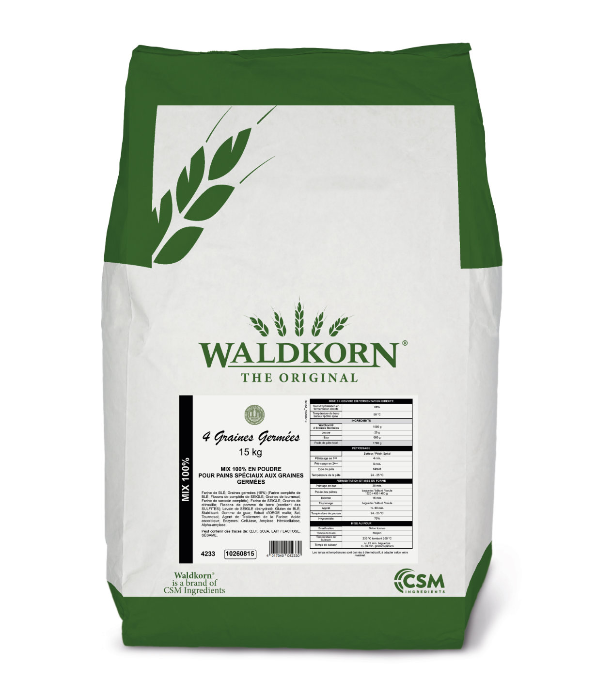 Avec une composition riche en ingrédients énergisants, le mixe est parfait pour créer de nouvelles références boulangères qui se dégustent comme du bon pain ! L’association de graines germées de blé, seigle, sarrasin et tournesol confère une saveur inimitable particulièrement douce et fruitée tandis que les graines de courge entières apportent la juste dose d’originalité et de croquant. Un délicieux mélange auquel s’ajoutent farine complète de blé, levain de seigle et orge malté pour encore plus de typicité et de caractère. Côté texture, le mixe Waldkorn® 4 Graines Germées garantit une croûte croustillante ainsi qu’une mie homogène à la mâche délicate grâce aux graines germées partiellement moulues et en flocons.