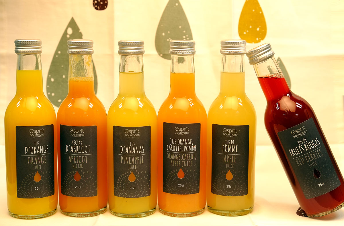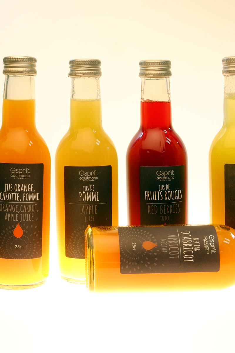 Distribués en bouteilles de 25 cl, ces jus jouent la carte de l’esthétisme sobre et authentique, soulignant le côté 100 % artisanal de la production. Esprit Gourmand se propose également de créer des étiquettes personnalisées, dans le sillage de son offre de sur mesure. La marque offre, de plus, une DLUO de 3 ans grâce à une flash pasteurisation qui préserve au mieux les qualités du produit.