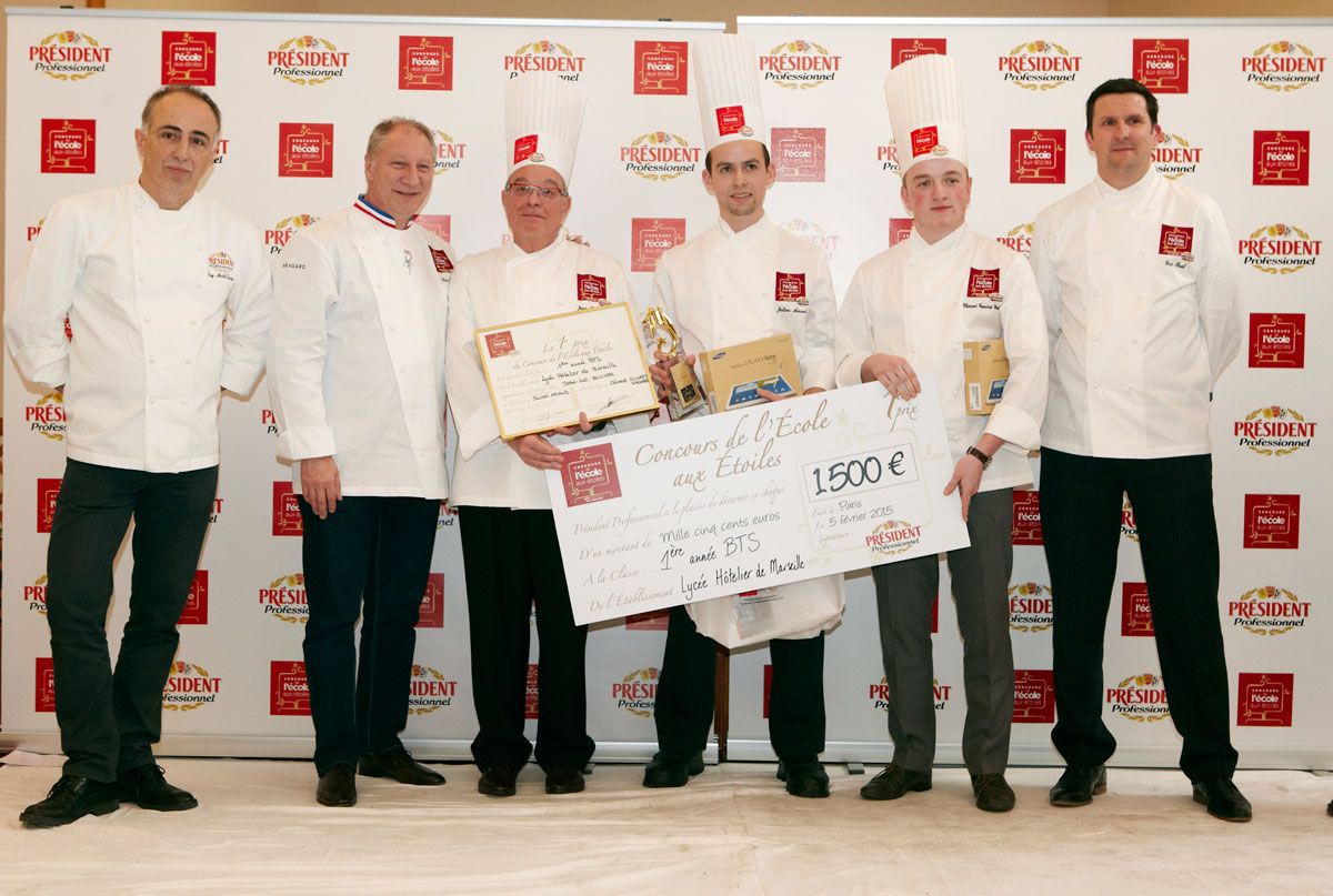 Le Concours de l’Ecole aux Etoiles 2015, présidé par Eric Frechon, M.O.F. et Chef des Cuisines de l’Hôtel Bristol à Paris, 3 étoiles au guide Michelin, à été remporté par la classe de première année de BTS du lycée technique hôtelier de Marseille, représenté par Jean-Luc Rouyer (le coach enseignant), Julien Assaud (l’élève candidat cuisine) et Clément Couvret-Wagner (l’élève reporter).