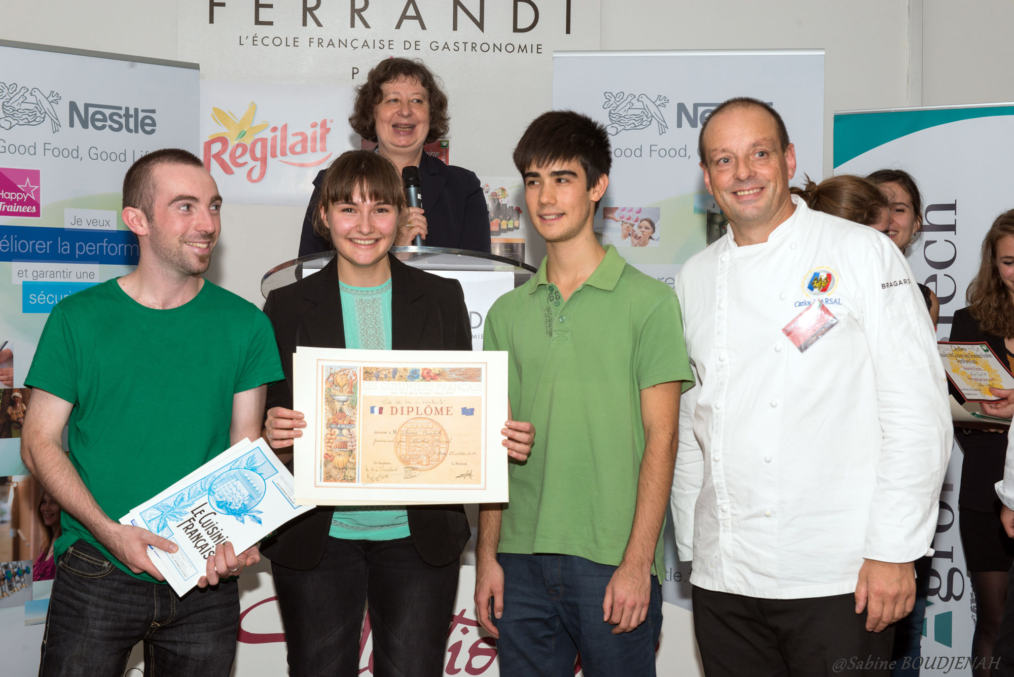 La finale de l’édition 2014 (parrainée par Nestlé), s’est déroulée le 25 octobre dernier à l’Ecole Ferrandi. L’une des douze équipes était constituée de trois futurs ingénieurs en chimie de « Paris Tech » : Mathilde Fievez, Jean-Baptiste Le Menn et Maximilien Maurice, accompagnés de Carlos Marsal, Chef des cuisines de l’Ambassade de France en Tunisie et membre de l’association « Les Cuisiniers de la République ». Les décennies qui à priori les séparaient, n’ont eu aucune influence sur l’instauration d’une belle complicité !