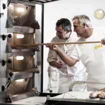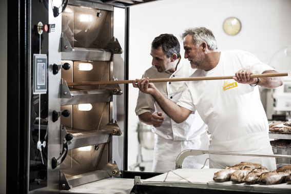 Le boulanger pétrit lentement la Bagatelle Label Rouge, suivant une recette exigeante : rien que de la farine, de l’eau, du sel et de la levure seule ou avec du levain. Puis la pâte repose longuement pour restituer tous les arômes du froment. Le pain est cuit dans un véritable « four à sole », qui permet de saisir parfaitement la pâte au moment où elle est enfournée. Sa croûte dorée et croustillante, sa mie odorante, moelleuse et aérée à la belle couleur crème, sont le signe d’une fermentation bien conduite.