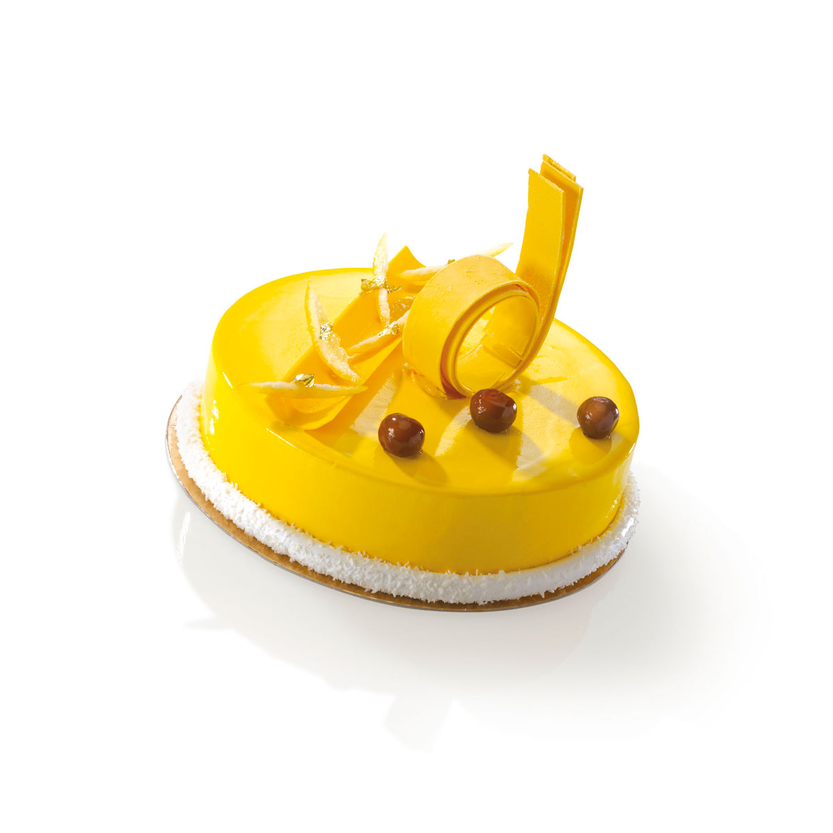 - Démouler les entremets, les glacer avec le glaçage miroir chocolat jaune,