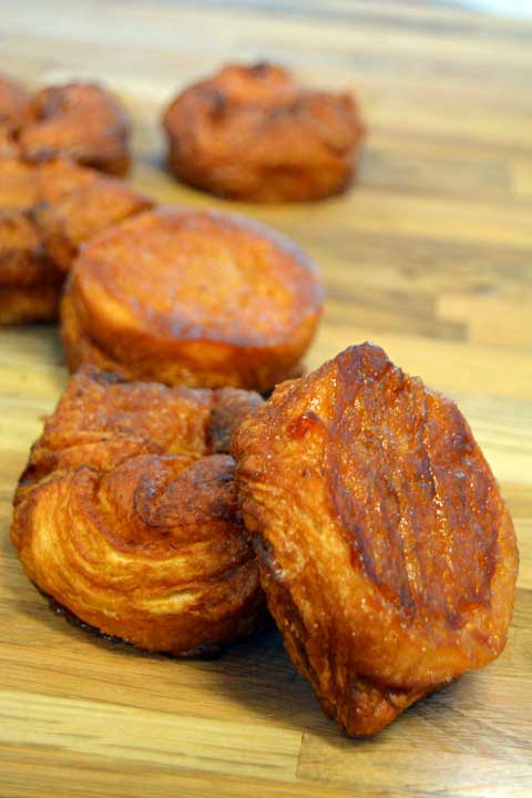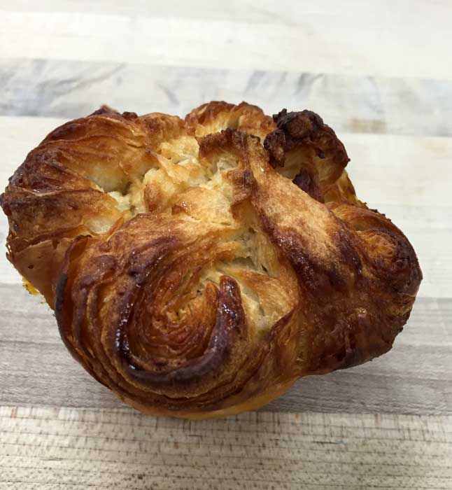 New York : «Kouign à l’orientale» par Eric Bedoucha, Chef partner de «Financier pâtisserie», (TDM 16, Janvier 2014). Eric a travaillé une pâte à croissant riche en beurre, sucre et miel d’acacia, façon baklava. Un clin d’œil à l’Algérie, pays qui l’a vu naître. Le feuilleté (avec un mix un peu plus liquide), étalé comme du pain aux raisins, avec des pistaches, noix et amandes concassées. Un peu de miel (d’acacia) au fond du moule et un peu pour l’arroser à la sortie du four. Beau succès auprès de la clientèle !