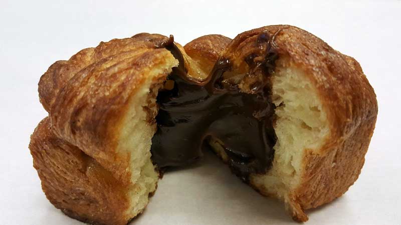 Californie: « Cubic Kouign Amann au chocolat », par Christophe Moreau, Director Bakery and Coffee de « Bristol Farms/Lazy Acres » (TDM 24, Septembre 2015). Le chef l’a imaginé avec un cœur au chocolat, toutes proportions gardées en farine, sucre et beurre. Après la cuisson (dans un moule carré en revanche), et le gâteau refroidi, une découpe se fait au centre avec un cercle pour le remplir de ganache crémeuse, avec un chocolat 73% monté à la chantilly. « Je le sers frais, c’est comme cela que je le préfère. Il garde tout son coté croustillant, qui se perd si on le réchauffe. »