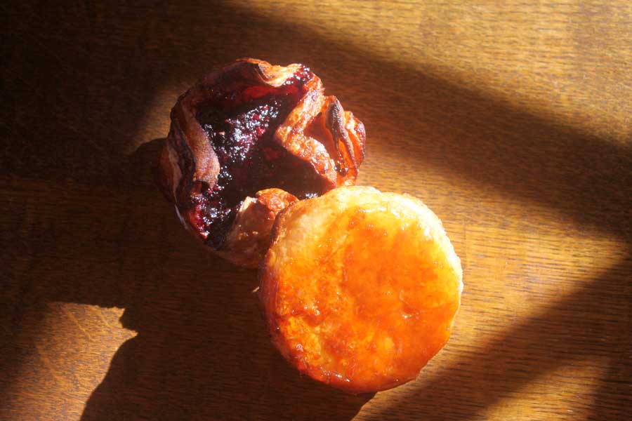 Japon : «Kouign Amann aux fruits rouges » par Frédéric Madelaine, «Le Pommier pâtisserie», Tokyo (TDM 26, Janvier 2016). Le chef l’avait déjà proposé avec beaucoup de succès dans sa version originale (au beurre normand, il n’oublie pas ses origines !). Il l’a décliné garni à l’intérieur d’une compotée de fruits rouges (myrtilles, framboises et groseilles additionnées d’un peu de sucre et de pectine), dans laquelle il intègre des cubes de pommes « kougyoku » une variété assez acide cultivée au nord du pays. Cubes confits une quinzaine de minutes dans l’appareil (en remuant souvent car il est peu sucré). «A la cuisson, le cœur s’ouvre et découvre la compotée. Ce gâteau n’est pas complètement moulé ni ″parfait″. Cela donne un coté artisanal que les clients aiment.»