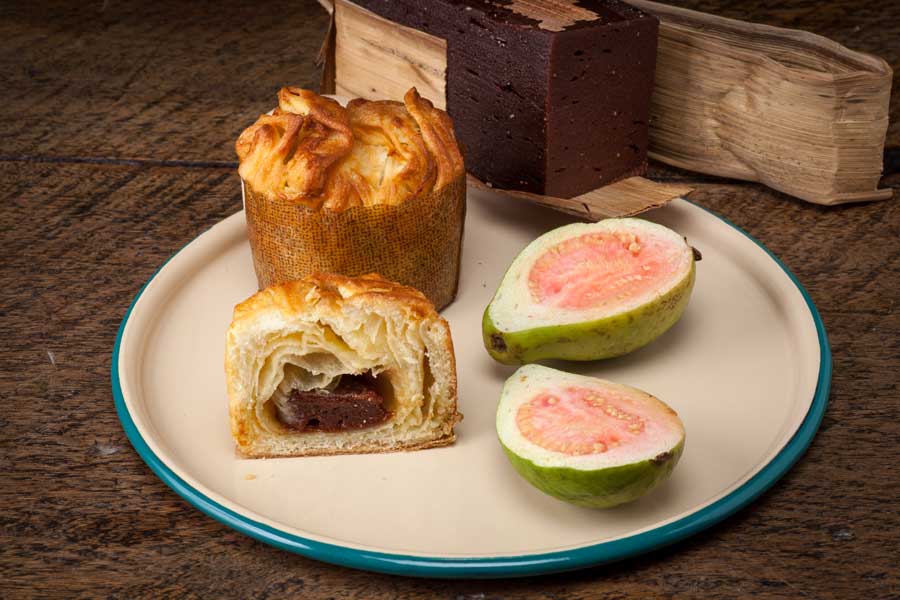 Colombie : « Kouign au cœur fondant à la goyave » de Camila Velez, Chef associée de «cocina soluciones », Bogota (TDM 31, Décembre 2016). En version classique, il est déjà un produit phare dans la gamme développée par la chef pâtissière. Pour sa revisite, elle s’est inspiré d’un dessert traditionnel qui associe une pâte de goyave (le ″bocadillo″, sorte de pâte de fruit, élaborée avec un sucre de canne non raffiné au goût intense), et de la mozzarella. L’autre inspiration venant du «pastel Gloria», met très populaire constitué d’une pâte feuilletée garnie au fromage, à la pâte de goyave… «J’ai mis la pâte de fruit au moment du pliage, qui donne après cuisson un cœur surprise tout fondant. C’est délicieux !»