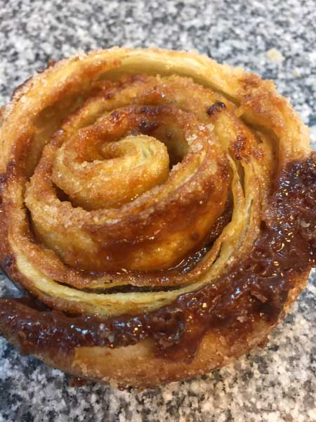 Suède : « Kouign Amann à la cardamome » de Sylvain Marron, pâtissier-chocolatier-confiseur Göteborg (TDM 28, Mai 2016). Le chef l’a allégé (750 g de beurre pour un kilo de farine), en y intégrant un produit phare de la culture scandinave. Ses deux premiers tours avec du beurre, les deux suivants avec du sucre, de la cardamome fraîche concassée, un peu de fleur de sel et quelques zestes très fins de citron frais. « J’ai voulu augmenter le coté agrumes de la cardamome et cela donne une belle association. » La cuisson s’est faite dans des moules de 8 cm, la pâte rabattue aux angles et au centre (qui donne une forme de fleur et apporte plus de fondant au gâteau). A déguster avec un chocolat chaud ou encore mieux, du café « cardamome, citron et café, cela va très bien ensemble ». Sylvain a proposé ce kouign pour les fêtes. Les clients ont adoré.