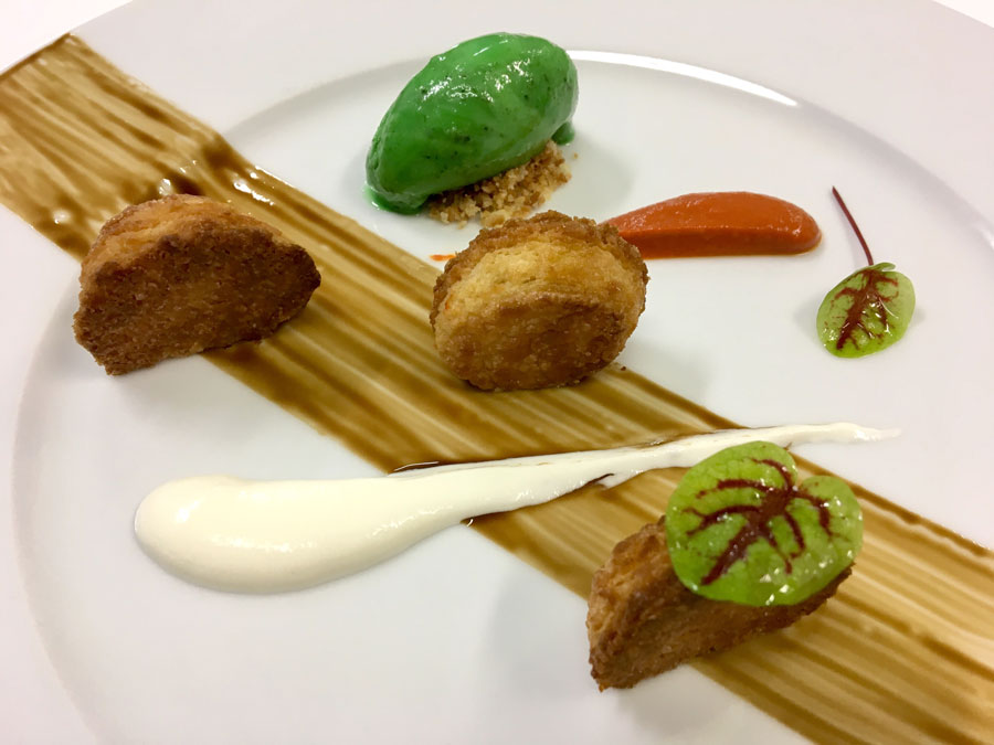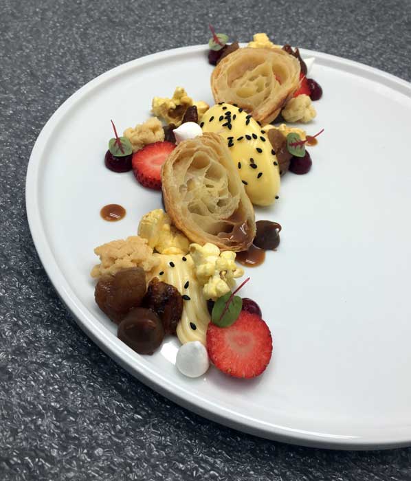 Taïwan : « Le K.A de Formosa » de Julien Perrinet, Executive pastry chef du Grand Hyatt Taipei (TDM 29, Septembre 2016). «K.A. c’est pour Kouign Amann. Formosa, parce que c’est l’ancien nom de l’île de Taïwan et je trouve que c’est joli…». Le chef breton a modifié les portions (avec moins de sucre et de beurre pour l’alléger et le mettre au goût du jour), en utilisant une pâte à croissant roulée dans le sucre, puis découpée en tranches pour avoir le coté croustillant. Il a ensuite joué pour le dressage en assiette, sur des ingrédients et des textures qu’il aime et se marient bien: une glace au beurre salé et sésame, du pop corn pour le coté crunchy et fun, une petite touche de fraise et de caramel au beurre salé. «Présenté à l’assiette, cela facilite la dégustation et donne l’opportunité d’associer chaque bouchée à sa guise.»