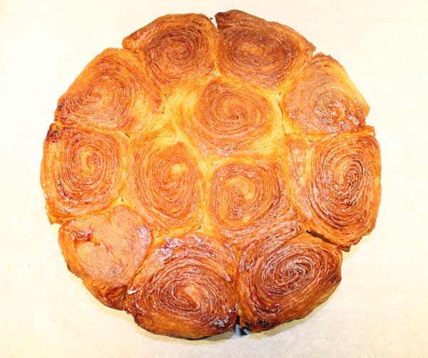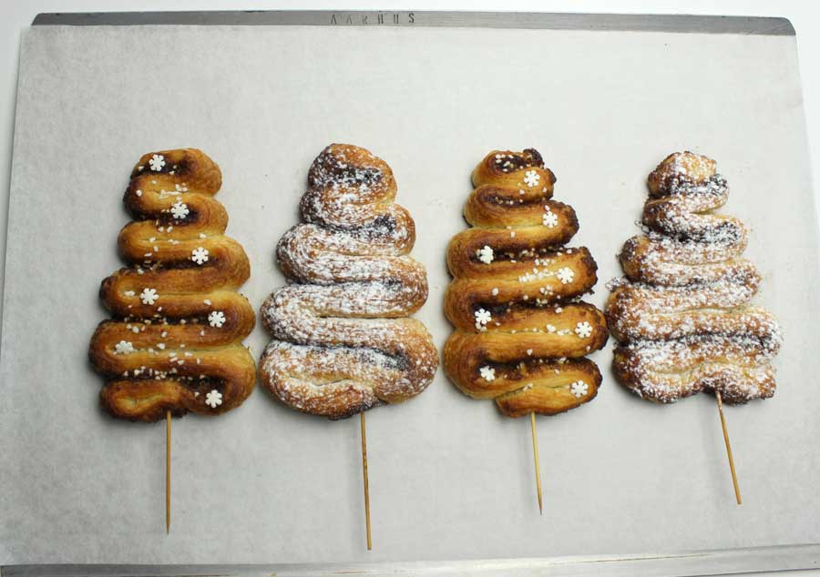 Danemark : «Kouign Amann de Noël» par Frédéric Terrible, pâtissier-chocolatier-confiseur, Copenhague (TDM 25, Mars 2015). Le chef lui a donné une forme de sapin, en intégrant de la cannelle et de la vergeoise (très appréciées au Danemark), faisant un tourrage comme pour une pâte à croissant. Un avec du beurre, un autre avec du sucre. Le troisième en y ajoutant la vergeoise et la cannelle (en poudre). L’appareil étalé sur 60 cm (qu’il a laissé pousser avec un peu de sucre pour coller la pâte), mis dans un cercle à tarte «sinon, le tronc est trop en hauteur et ce n’est pas esthétique». Au résultat, une création savoureuse et jolie, travaillée en fin d’année avec ses élèves.