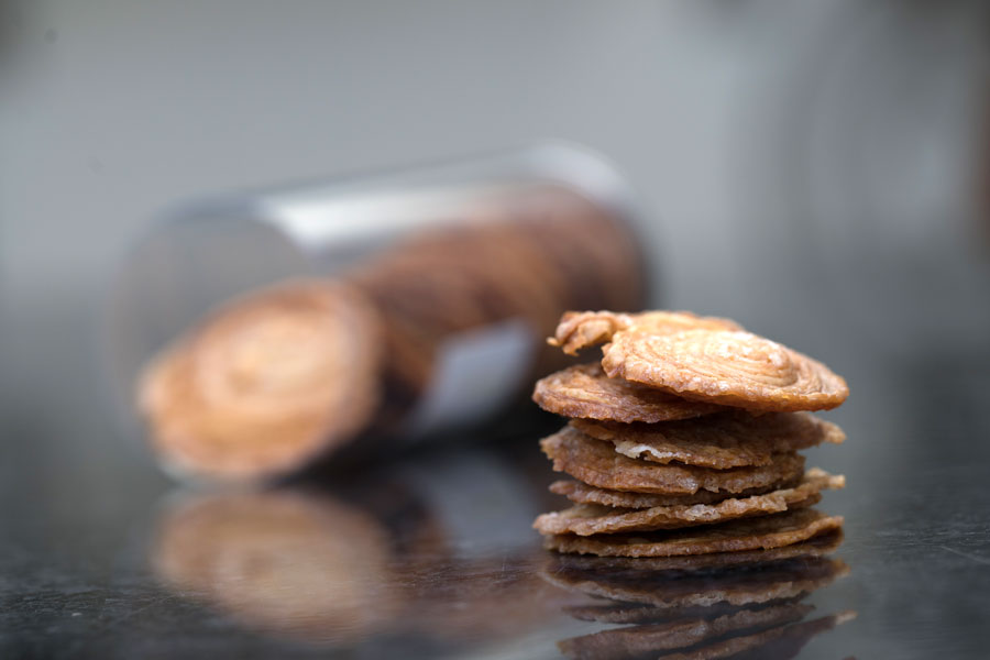 Dernière escale : la Bretagne avec le «Crousti-Breizh», une création de Pièr-Marie Le Moigno « Pâtisserie Pièr-Marie », Lorient. L’ancien Chef pâtissier du Park Hyatt place Vendôme a rejoint sa ville natale pour ouvrir en juin 2014 , une boutique-salon de thé avec sa compagne Gaëlle. Pour ce «crousti-breizh» présenté en boîte d’une vingtaine de pièces, les proportions en farine, sucre et beurre son gardées. Le tranchage et la cuisson changent : l’abaisse est roulée sur elle-même, puis taillée très fin avec un couteau éminceur (le seul outil qui fonctionne, rendant l’opération longue et délicate). Ces «chips» sont ensuite cuits dans des moules individuels. «Pourquoi l’idée ? C’est une identité bien de chez nous, idéale pour une pause sucrée.». Une création à retrouver dans l’ouvrage «A la folie» de Raphaëlle Marchal (ed. Tana, paru en novembre dernier), qui réunit les coups de cœur de 60 pâtissiers français.