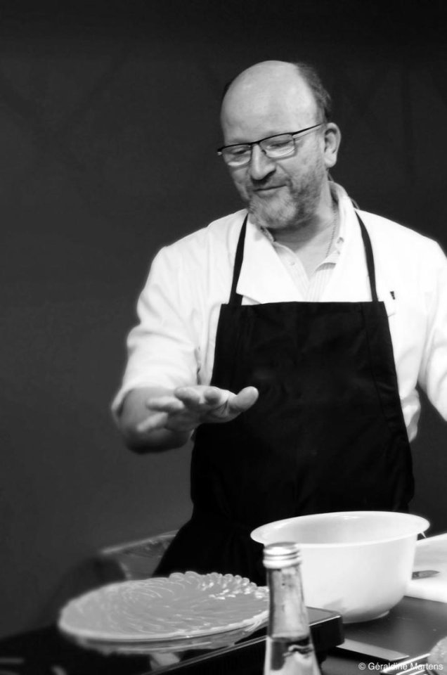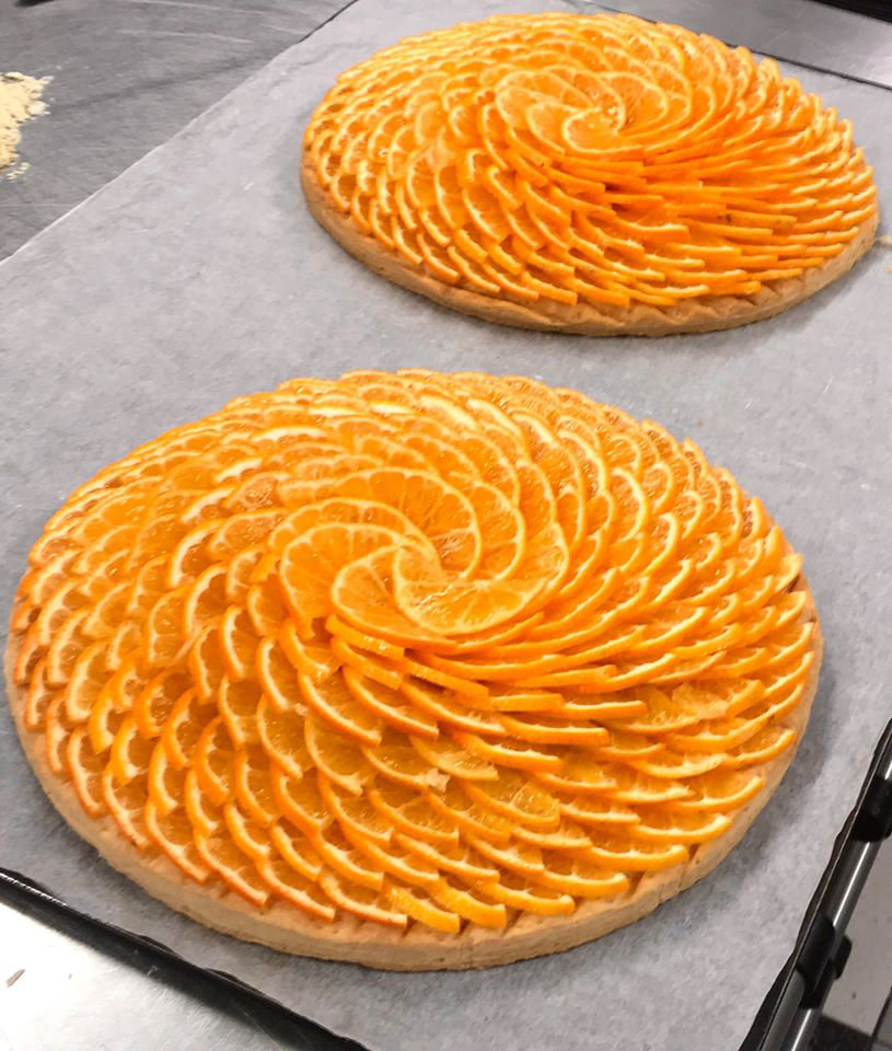 Quid d’une tarte abricots au feuilletage inversé, du beurre noisette lié avec des amandes puis mise au four. « Rien d’autre, pas de crème, pas de nappage, la cuisson est plutôt du rôtissage. J’ouvre ma tarte pour qu’elle profite de la chaleur du four. Si les fruits ne sont pas très juteux (je le vois à la coupe) je resserre ma tarte, pour la protéger du dessèchement. Tout est dans la superposition du fruit. »