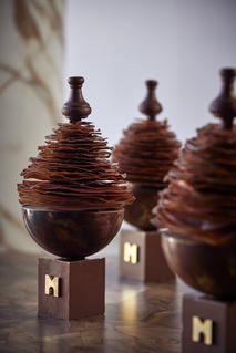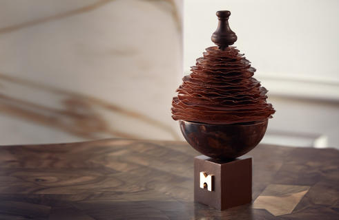 Le chef explique la démarche : l’idée était de pouvoir le consommer comme une boîte de biscuits. Une fois l’embout enlevé on peut prendre chaque feuillet un à un. Chaque feuille de pastilla est glacée en dessous de praliné au sésame blond, de sésame caramélisé et de chocolat au lait. Il sera enrobé par la suite très finement. Donc toutes les feuilles sont empilées sur un tube pour les maintenir. La demi-sphère de chocolat dans un effet de vieux bois vernis était garnie de bonbon de chocolat classique. Celui-ci était encore posé sur une petite stèle pour le mettre en valeur avec le logo du Royal Mansour qui leur est cher pour tout ce qu’il porte et leur apporte.