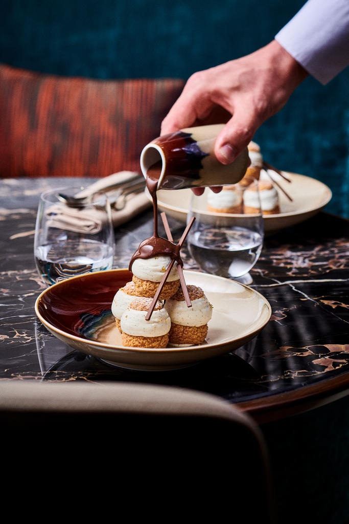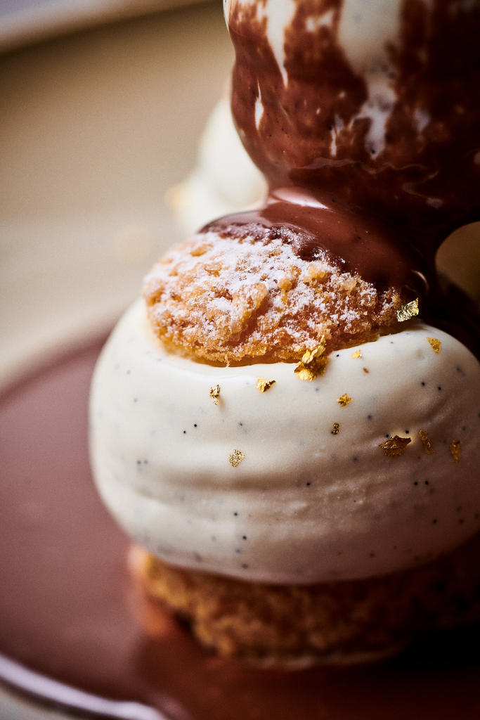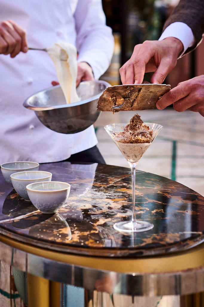 L’univers sucré n’a pas de références phares, les cartes sont toujours en mouvement. L’ensemble suit en revanche des lignes directrices, comme celle d’avoir toujours un fruit givré au restaurant Le Jardin, toujours un dessert à base de pastilla à La Grande Table Marocaine, une partie de desserts traditionnels régressifs à La Grande Table Française, toujours cette grande glace turbinée à la minute servie au restaurant italien Sesamo…