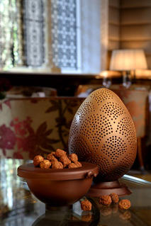 Par les échanges avec les artisans et historiens, une curiosité sans cesse régénérée et enrichie de nouvelles rencontres, naissent dans le laboratoire des créations telles les bûches « Zelliges », l’œuf de Pâques façon jarre, ou l’œuf en chocolat travaillé dans un esprit de cuir délicatement ouvragé…