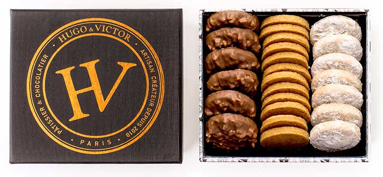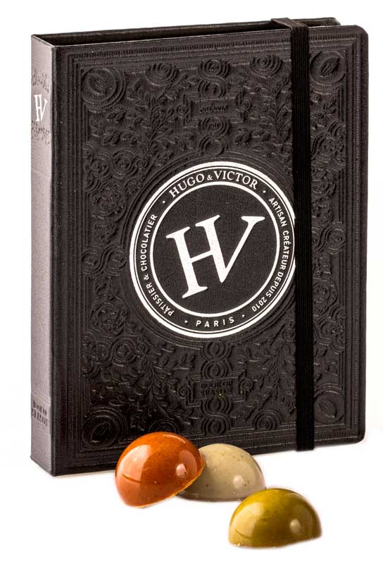 Hugo & Victor proposera trois catégories de produits sur Amazon : Les chocolats, chez Hugo & Victor, ce sont tout d’abord d’exquises tablettes de chocolat noir ou au lait issues de la créativité et du savoir-faire d’Hugues Pouget, mais surtout les incontournables coffrets écrivains prenant la forme de jolis trompe-l’oeil : ces carnets noirs et élégants à l’apparence de livres renferment de délicieux carrés de chocolat ganaches ou pralinés. Plusieurs formats et types d’assortiments sont proposés ; un carnet peut ainsi contenir 6, 12, 24 ou 48 carrés enrobés de chocolat ou demi-sphères au caramel coulant associé aux fruits de saison tels que la clémentine ou la poire.