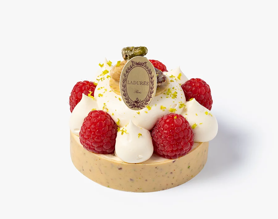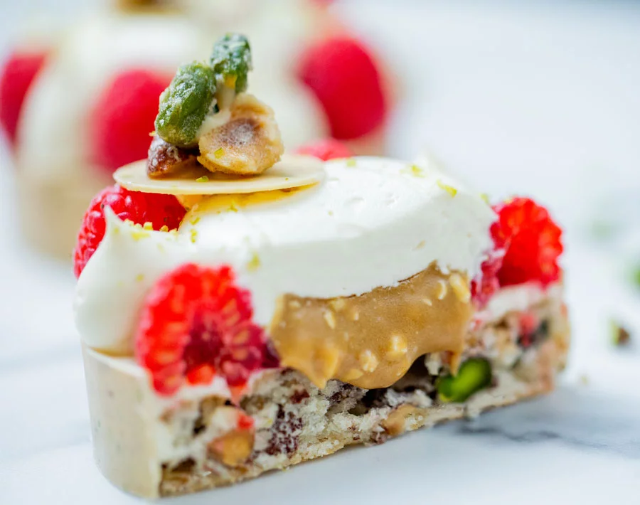 Il est décoré d’une chantilly nougat, de framboises fraiches garnies d’un confit de framboise, de pistache râpée et d’un mendiant aux fruits secs sablés.