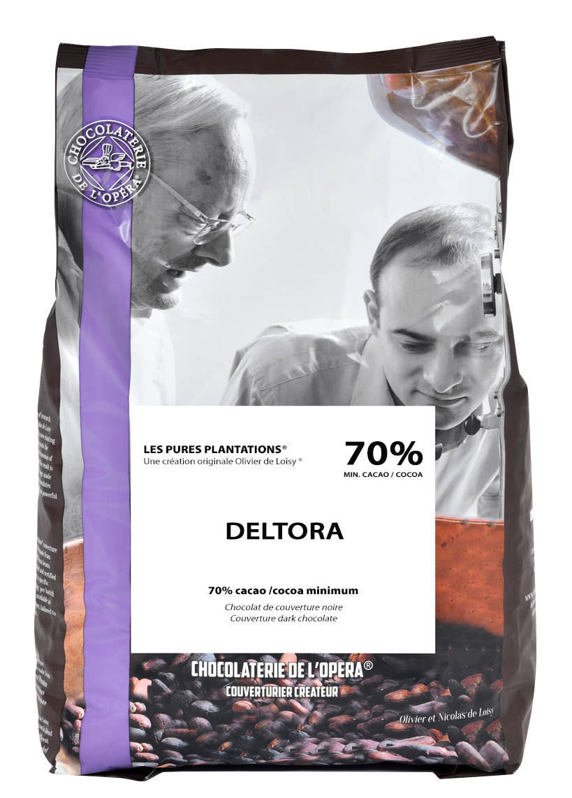 Issu d’un terroir unique et d’un seul profil génétique de fèves de cacao, DELTORA 70% appartient à la gamme Pures Plantations®. La recette est la même que pour les autres recettes de la gamme : 70% de cacao et 44% de beurre de cacao. Son utilisation est idéale pour la réalisation d’enrobages et tablettes mais cette couverture peut aussi servir à la réalisation de ganaches et de mousses. Chocolat vendu en gouttes (sacs de 5kg).