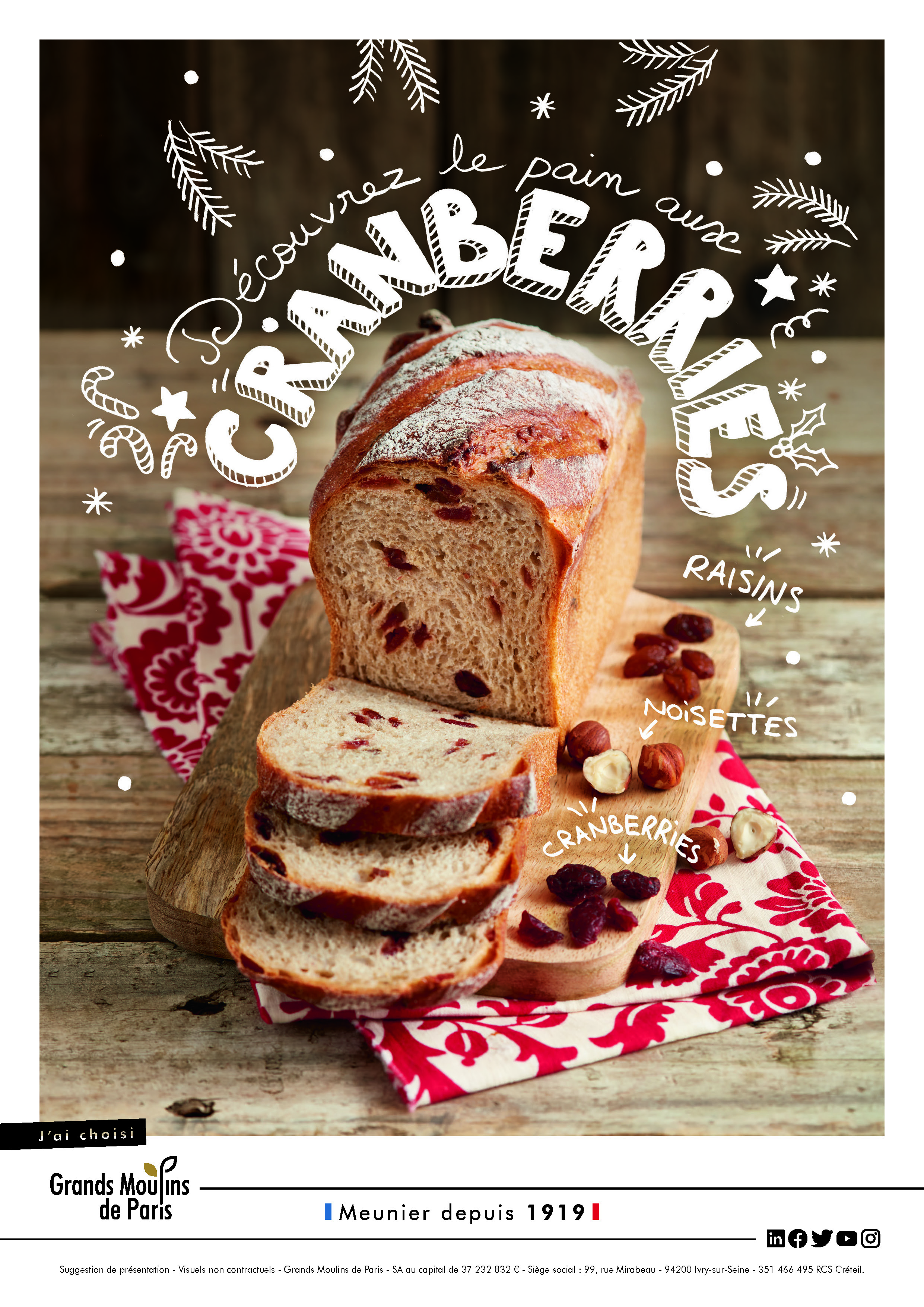 Grands Moulins de Paris est fier de vous présenter son nouveau mélange meunier : le « pain aux cranberries ». Fabriqué sur le site de Briare, ce mélange meunier riche en inclusions gourmandes (cranberries, raisins secs et noisettes) se distingue par des notes douces et sucrées associées à une mie moelleuse et typée grâce à la farine de seigle.