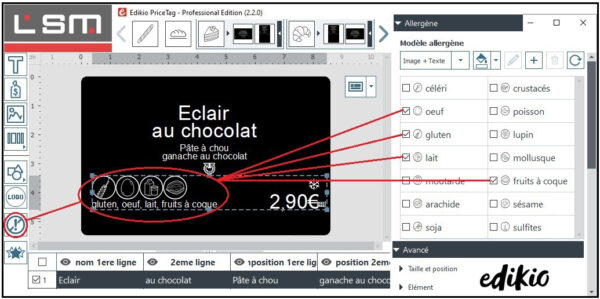 La dernière version du logiciel intègre la gestion simplifiée des allergènes. En cliquant dans la liste, vous affichez chaque allergène (pictogrammes + texte, texte ou pictogrammes uniquement). Cela évite de taper l’intégralité des textes et d’insérer les images une par une. Un vrai gain de temps ! Pour rappel, l’indication des allergènes est recommandée. Bénéficiez du large panel de fonctionnalités du logiciel pour créer et imprimer des étiquettes de prix attractives, facteur essentiel à la vente. LSM fournit une large gamme de supports étiquettes pour une présentation soignée en vitrine.