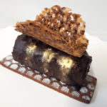 Croustillant praliné, biscuit joconde au café, sirop au café, crémeux à l'orange, mousse chocolat au lait au café, glaçage au café.