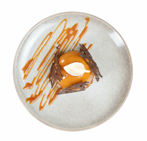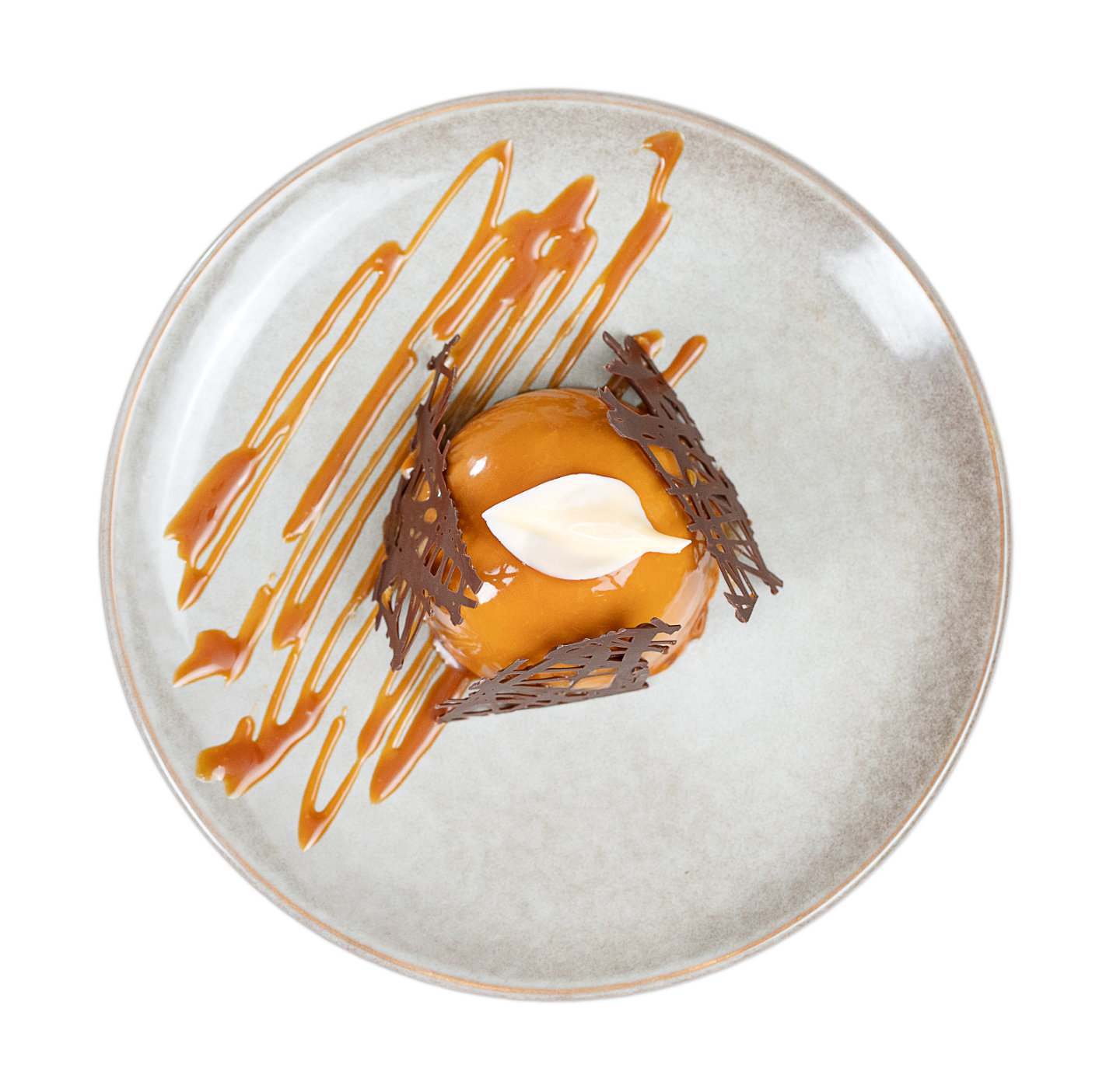 Stéphane glacier a imaginé une subtile alliance entre un croustillant praliné, le moelleux d’un biscuit joconde au café Pur Arabica, un crémeux à l’orange et la légèreté d’une mousse au chocolat au lait au café Pur Arabica, le tout sous un glaçage chocolat au café Pur Arabica. Un gâteau individuel qui séduira les vrais amateurs de café et attirera les autres grâce à l’extrait au café Pur Arabica, qu’il sublime. Un appétissant dôme arrondi qui embellira les vitrines des pâtisseries ou ornera les assiettes des restaurants.