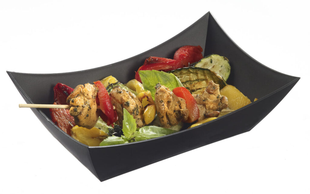 La Barquette Snacking LOOP est quant à elle idéale pour servir et déguster toutes les formules snacking (brochettes-frites, salades composées, etc.).