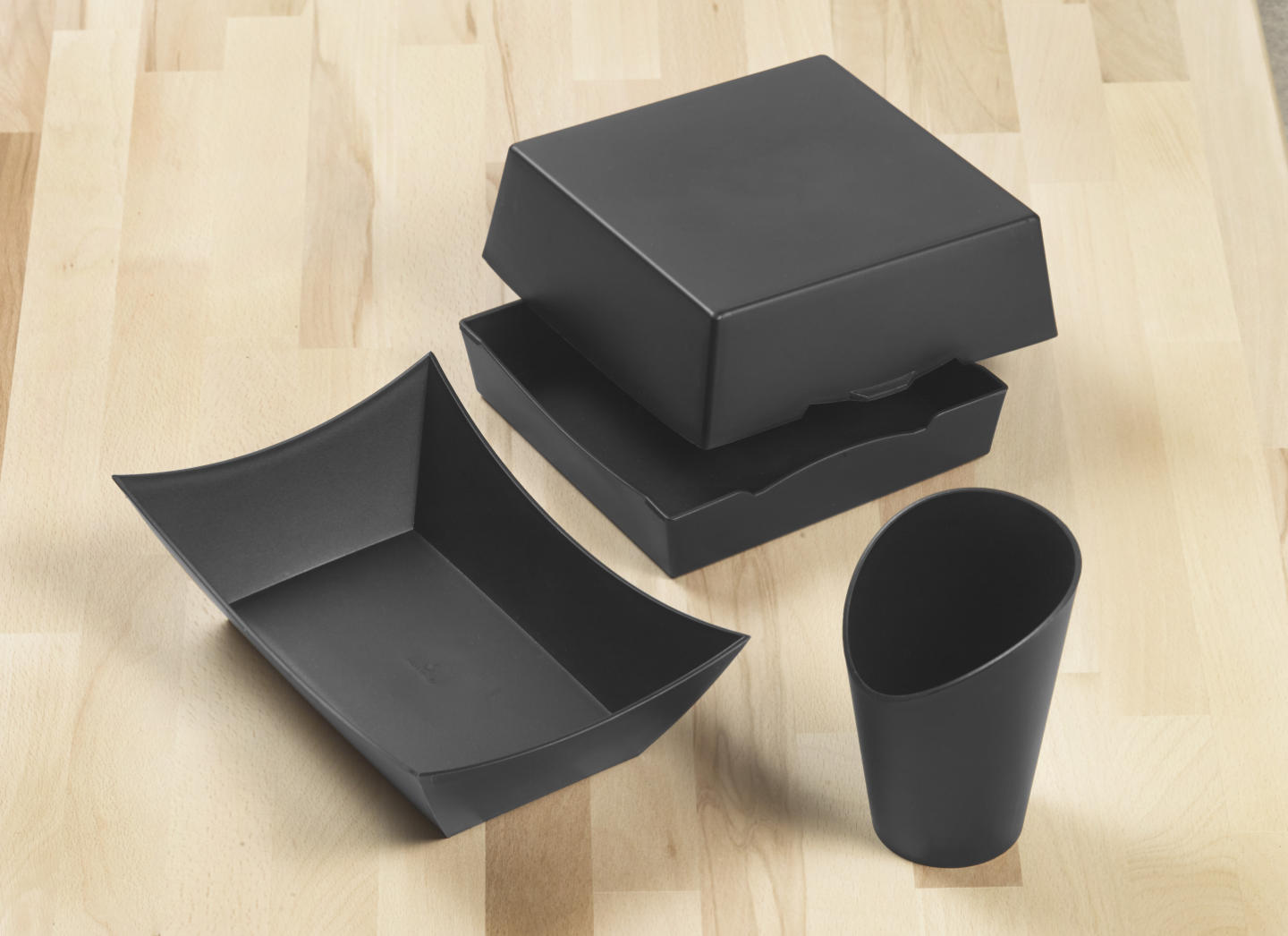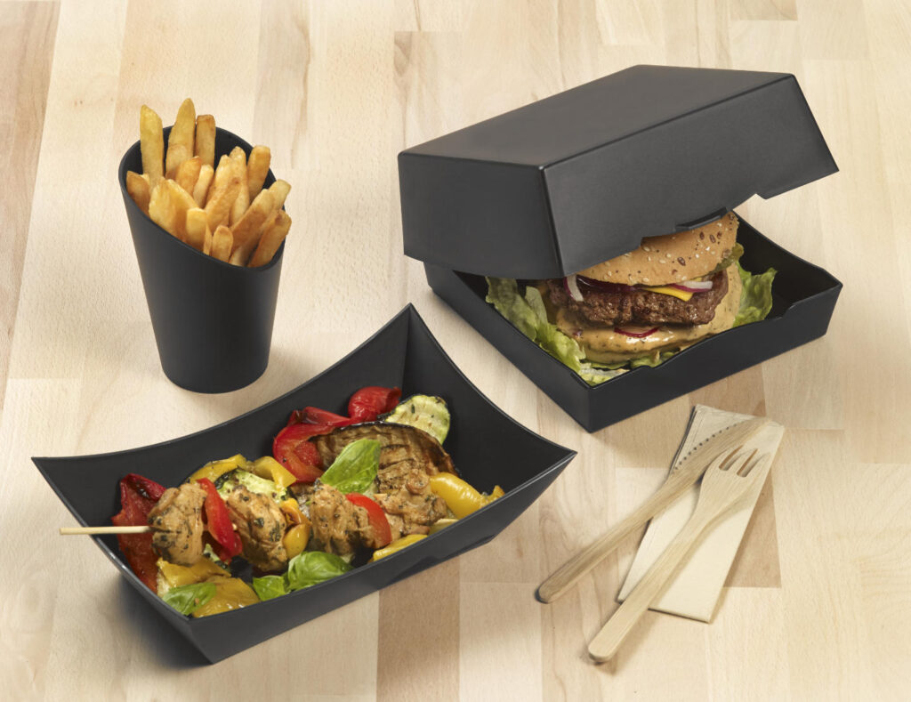 Cette collection accompagne les professionnels de la restauration qui, depuis le 1 janvier 2023, sont dans l’obligation de servir les repas pris sur place dans des contenants réutilisables (AGEC). Un pas de plus pour limiter l’usage unique et répondre aux attentes des consommateurs en matière de protection environnementale. Comprenant un saladier, un pot à frites, une boîte à burger et une barquette, la gamme LOOP est fabriquée en PP, un plastique rigide qui garantit la durabilité à l’usage, le réchauffage au four micro-ondes et le lavage professionnel. En termes de design, les produits reprennent les mêmes codes que la vaisselle en carton et sont proposés dans un coloris noir mat afin de résister aux colorations par les aliments.