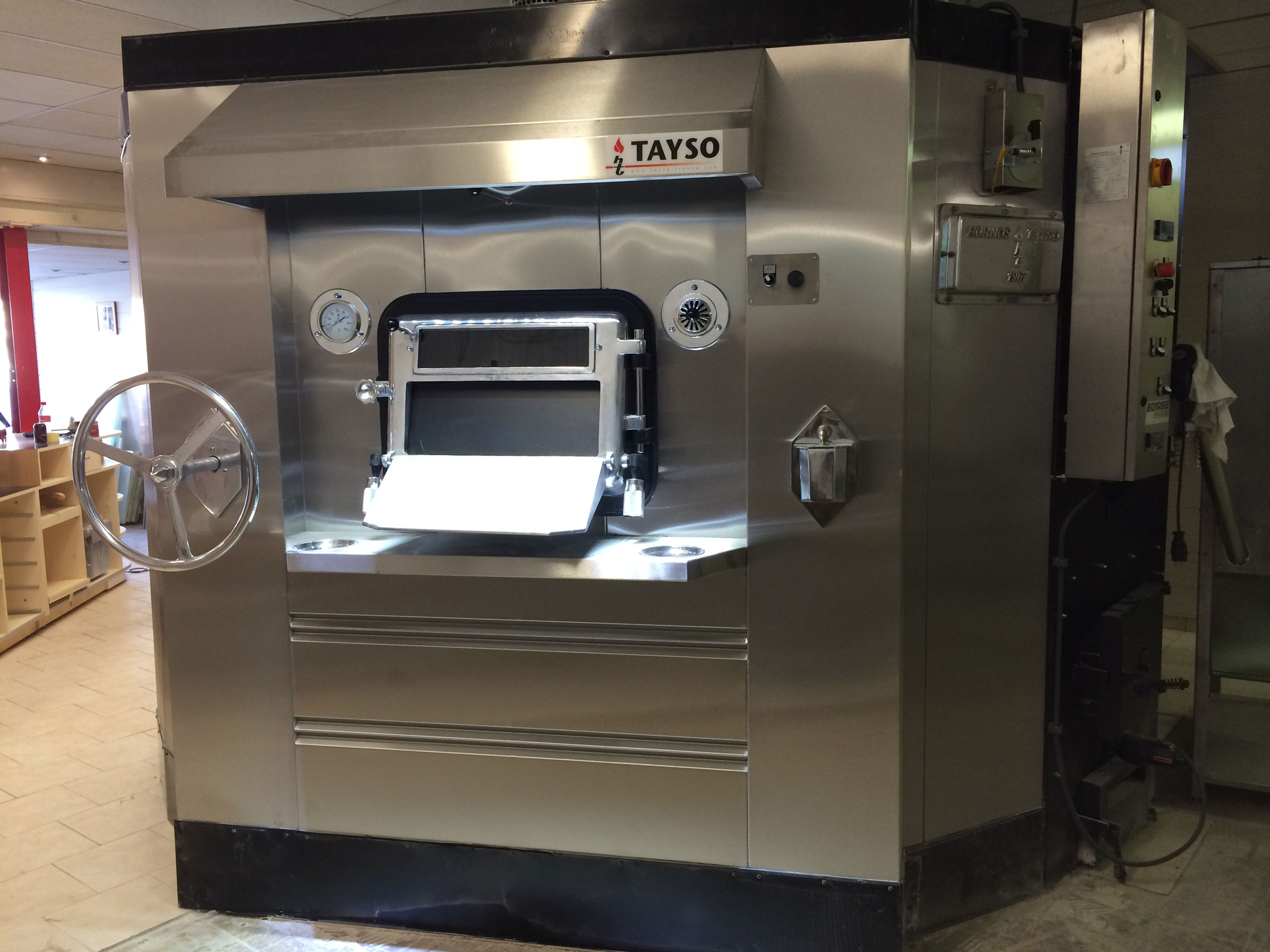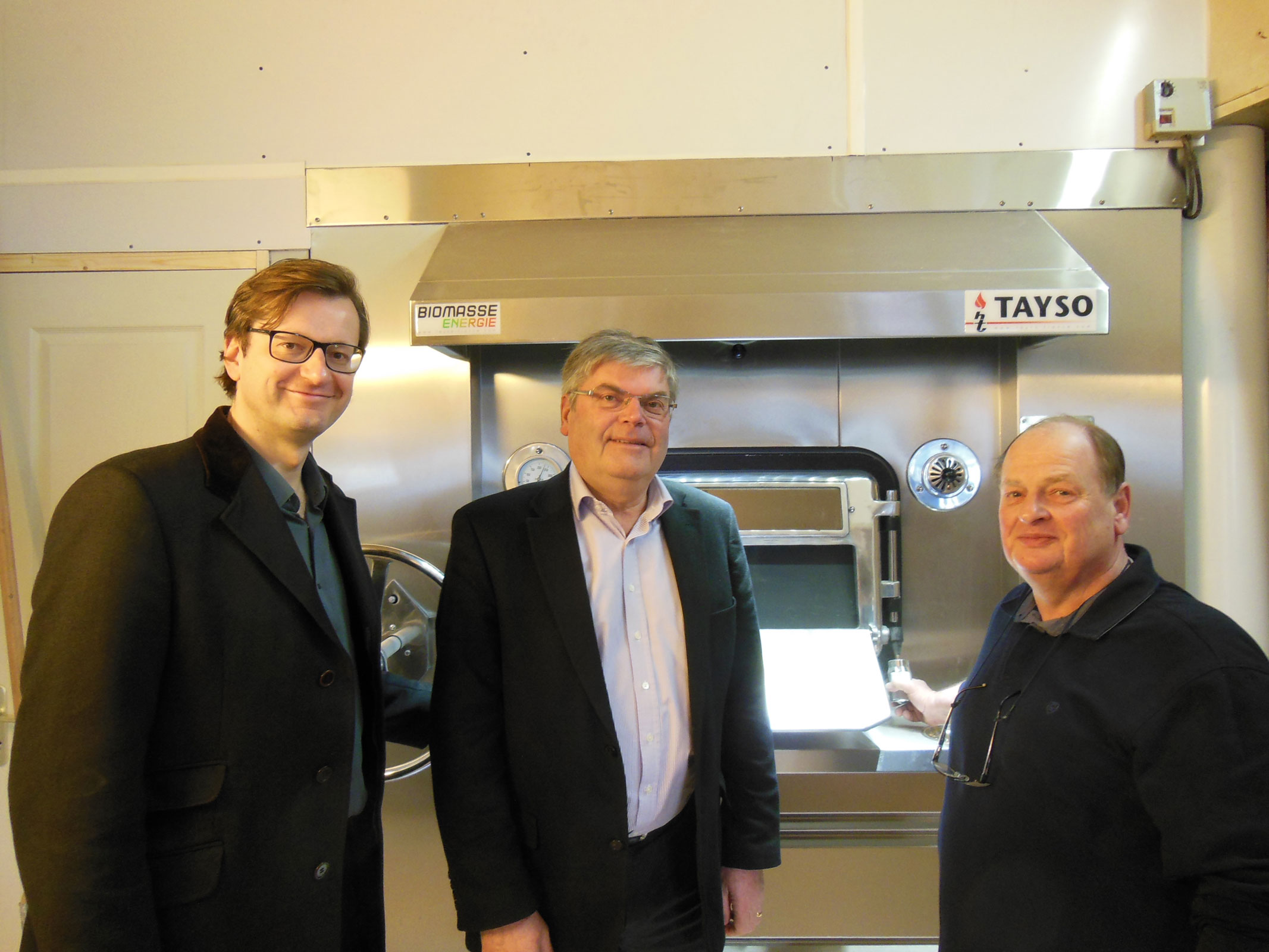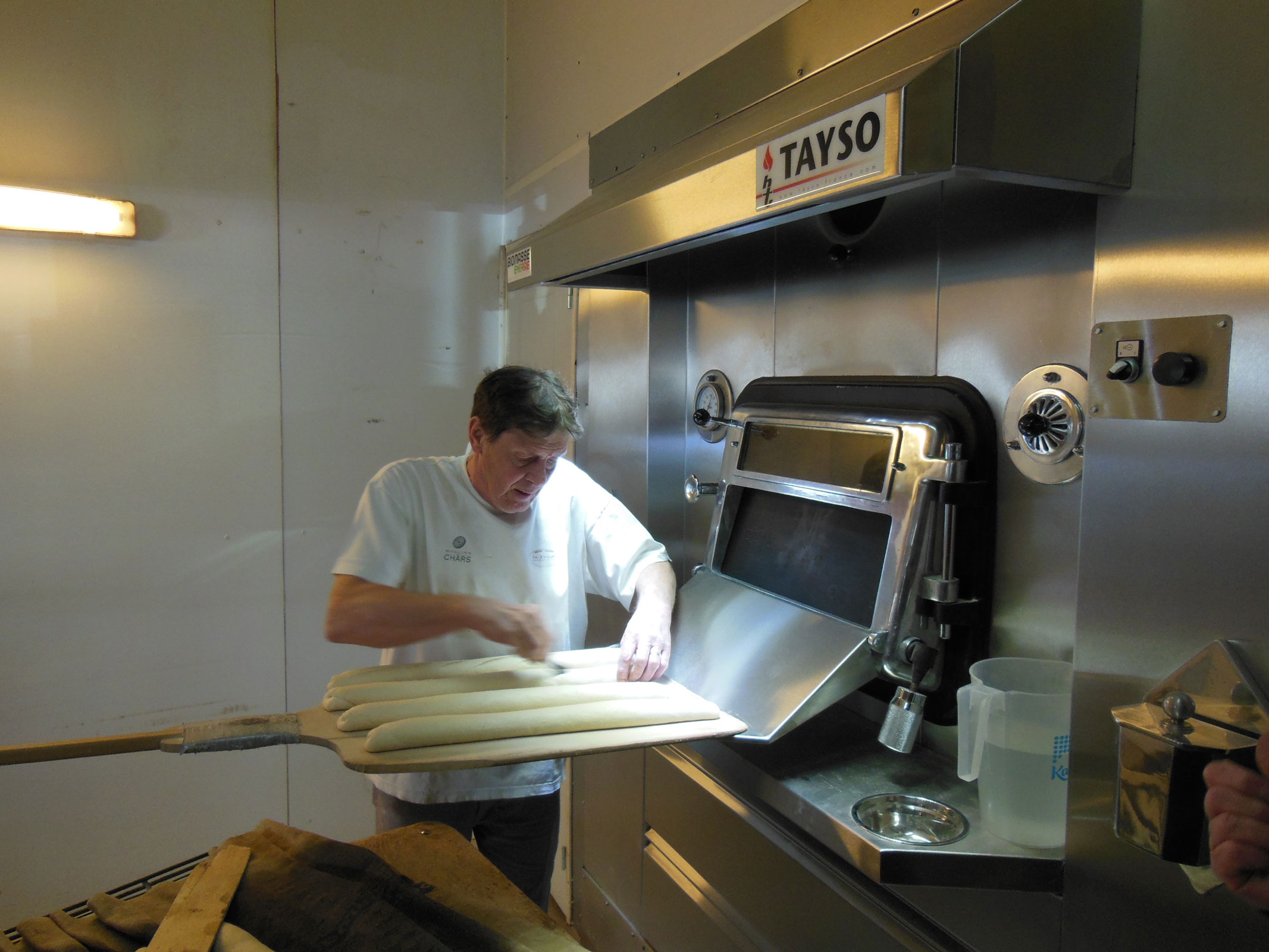 En présence de Monsieur le Maire de Pont-Sainte-Maxence, Arnaud Dumontier, et du Président du Comité de Commune, Monsieur Christian Massaux, Yoann et Bruno Lefebvre, ont troqué le long discours par la preuve par quatre. Le premier sujet abordé fût celui du résultat de cuisson. La boulangerie de Pont-Sainte-Maxence est équipée de trois fours : un four à sole traditionnel et un four rotatif au gaz, et le dernier installé de chez Tayso, le four à sole tournante aux granulés de bois sans brûleur. A la même fournée et fermentation, une partie de la cuisson fût exécutée dans le four traditionnel à sole et l’autre dans le four à sole tournante biomasse. Sans parler d’économie, la brillance du pain était légèrement plus attractive sur le four à sole tournante. La température est linéaire et la cheminée se ferme automatiquement lorsque le four n’est pas en demande de chauffe. En ce qui concerne les économies d’énergie, les preuves furent apportées par la facturation en énergie sur l’autre boulangerie qui exploite la biomasse et tout doute est levé. La cuisson dans un four biomasse et sans brûleur Tayso permet une économie de près de 42 %. Un autre bénéfice de la biomasse est la possibilité de pouvoir continuer de cuire malgré une panne de courant en alimentant manuellement le foyer. En effet, seule est nécessaire une prise de courant de 220 volts pour faire fonctionner la trémie et la vis sans fin qui charge automatiquement le foyer et en cas de panne d’électricité, vous pourrez toujours cuire en alimentant manuellement ce foyer qui ne demande qu’à vous sortir de ce vilain « pétrin » !