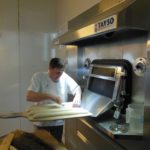 Jeudi 12 mars, 9h, et toute l’équipe est au complet. Rien d’extraordinaire, juste ce qu’il faut pour démontrer l’art et la manière d’utiliser un four à sole tournante en économisant minimum 40% d’énergie en comparaison à des fours traditionnels électriques, gaz ou fioul. Nous avions ici la démonstration d’un four à sole tournante, mais Yoann et Bruno sont équipés dans leurs deux autres boulangeries de fours biomasse à sole et rotatif. Le constat reste identique à l’égard des économies d’énergie en ce qui concerne la biomasse à sole fixe, à sole tournante et à chariot rotatif. L’écologie et l’économie sont passées par là mais aussi une nouvelle technologie permettant de cuire sans brûleur. Vous avez bien lu ! Sans brûleur, système breveté.